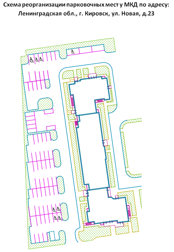 Схема реорганизации парковочных мест у МКД по адресу: Ленинградская обл., г. Кировск, ул. Новая, д.23. Вопрос включен в ОСС от 03.07.2023